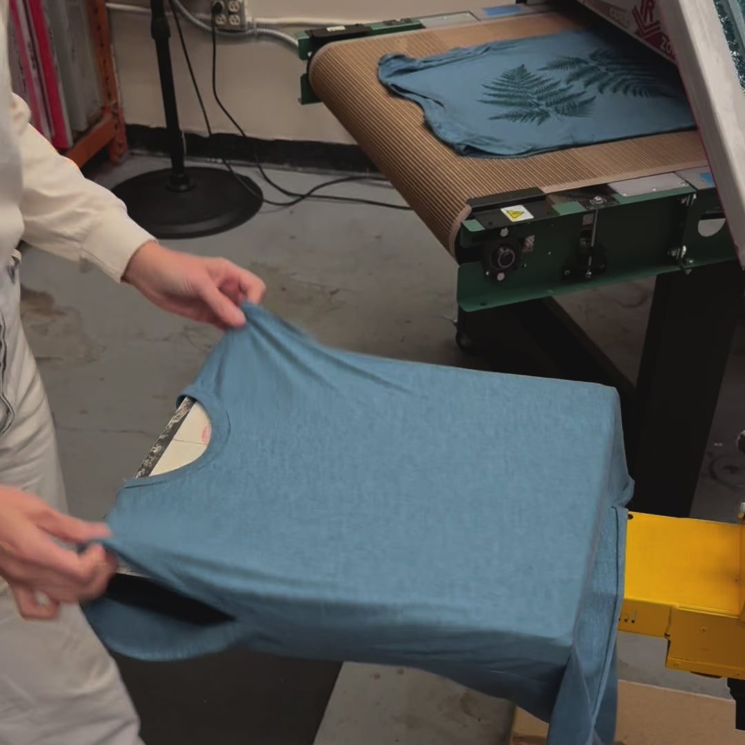 Our Understory design features a pair of oversized dark green fern leaves stretching over the entire chest of the shirt. A go-to choice for post workouts and yoga classes, this lightweight top is super soft and features a lovely high-low bottom hem & rolled cuff sleeves.