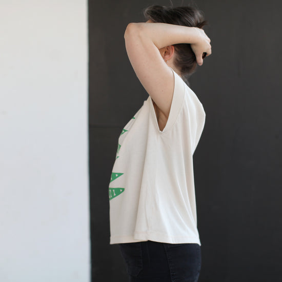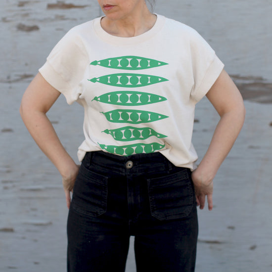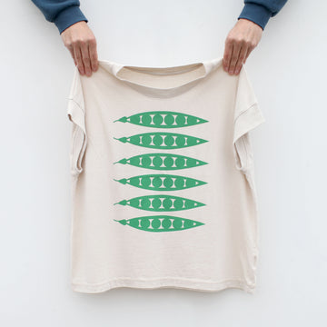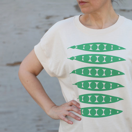 To help ring in the warmer weather (and the prime gardening season), we've put an Art Deco spin on a little harvest of green pea pods. Hand-printed in mint green ink onto relaxed fit, boxy cap sleeves in natural.