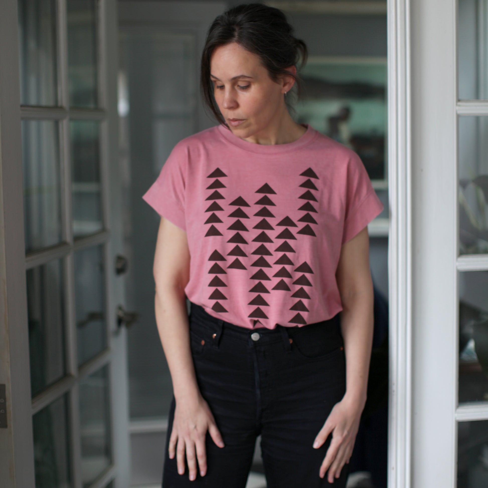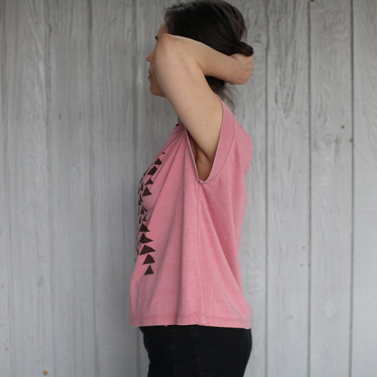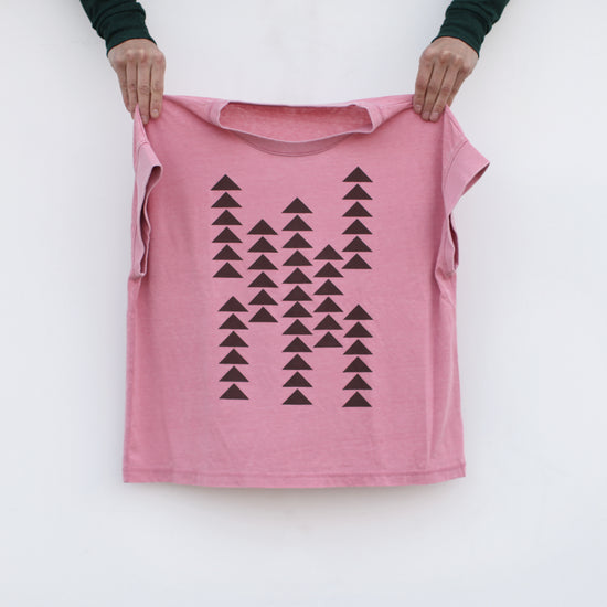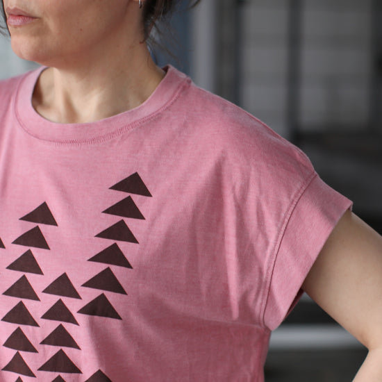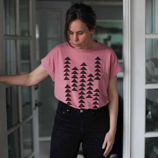 A minimalist, geometric print in fresh colors for spring, this classic top pairs cascading triangle prints with a super flattering jersey knit silhouette. Each is hand-printed in dark brown water based ink onto mauve boxy cap sleeve tees. Available in women's sizes S-2XL.