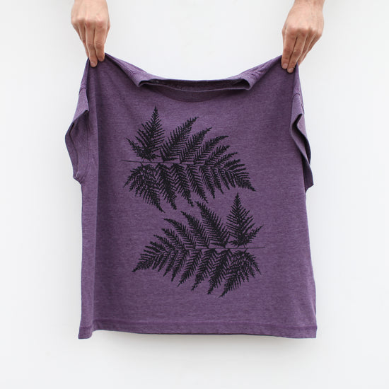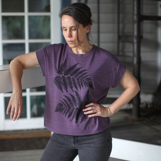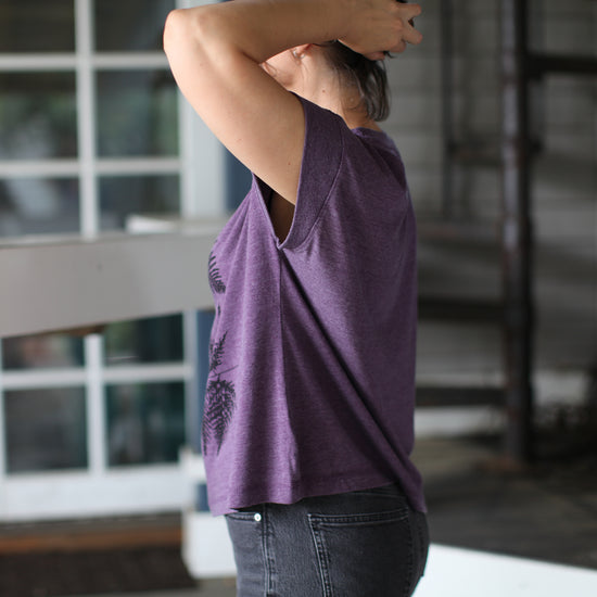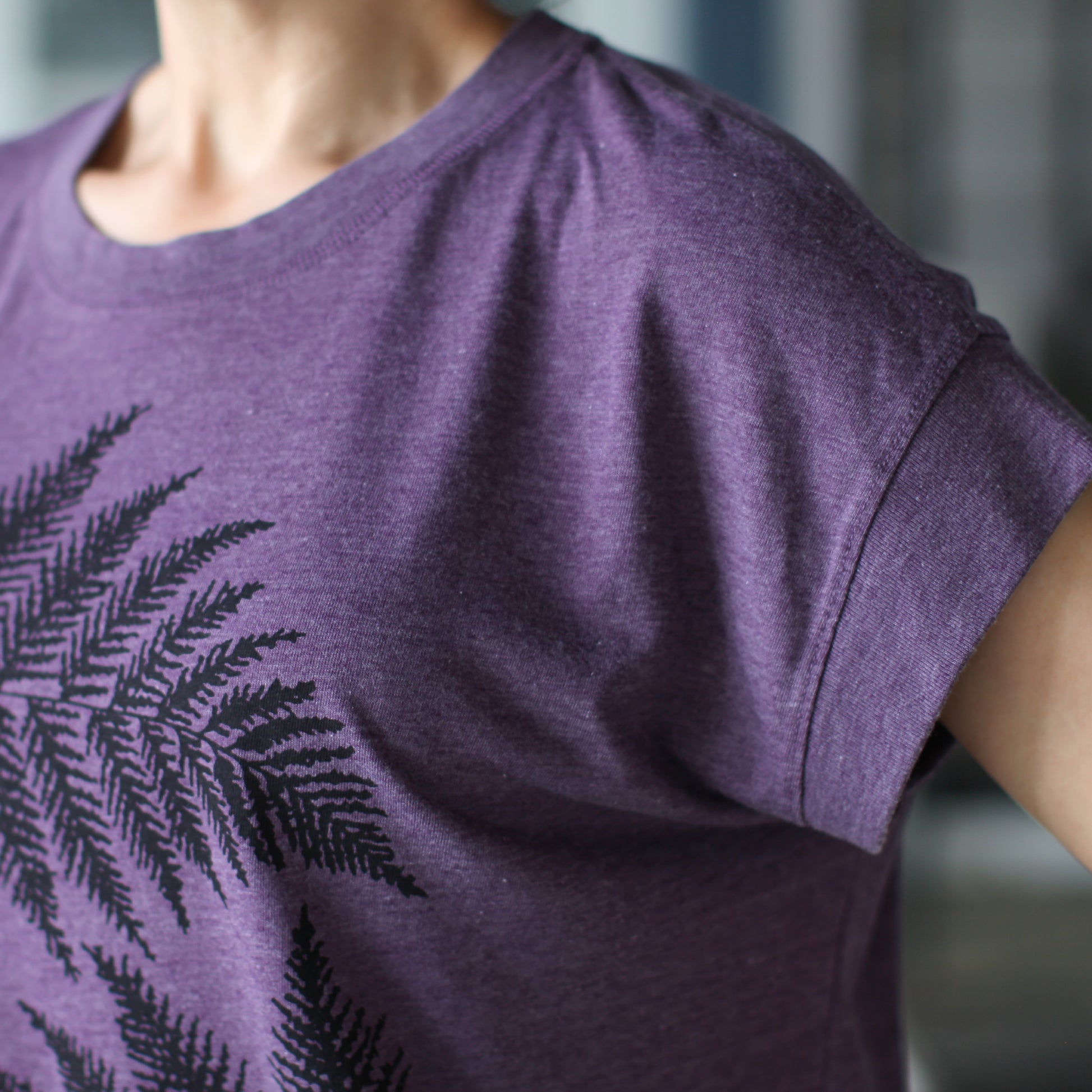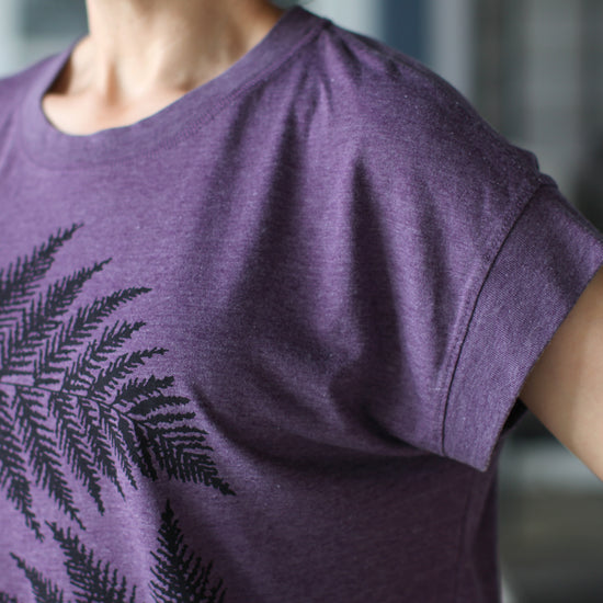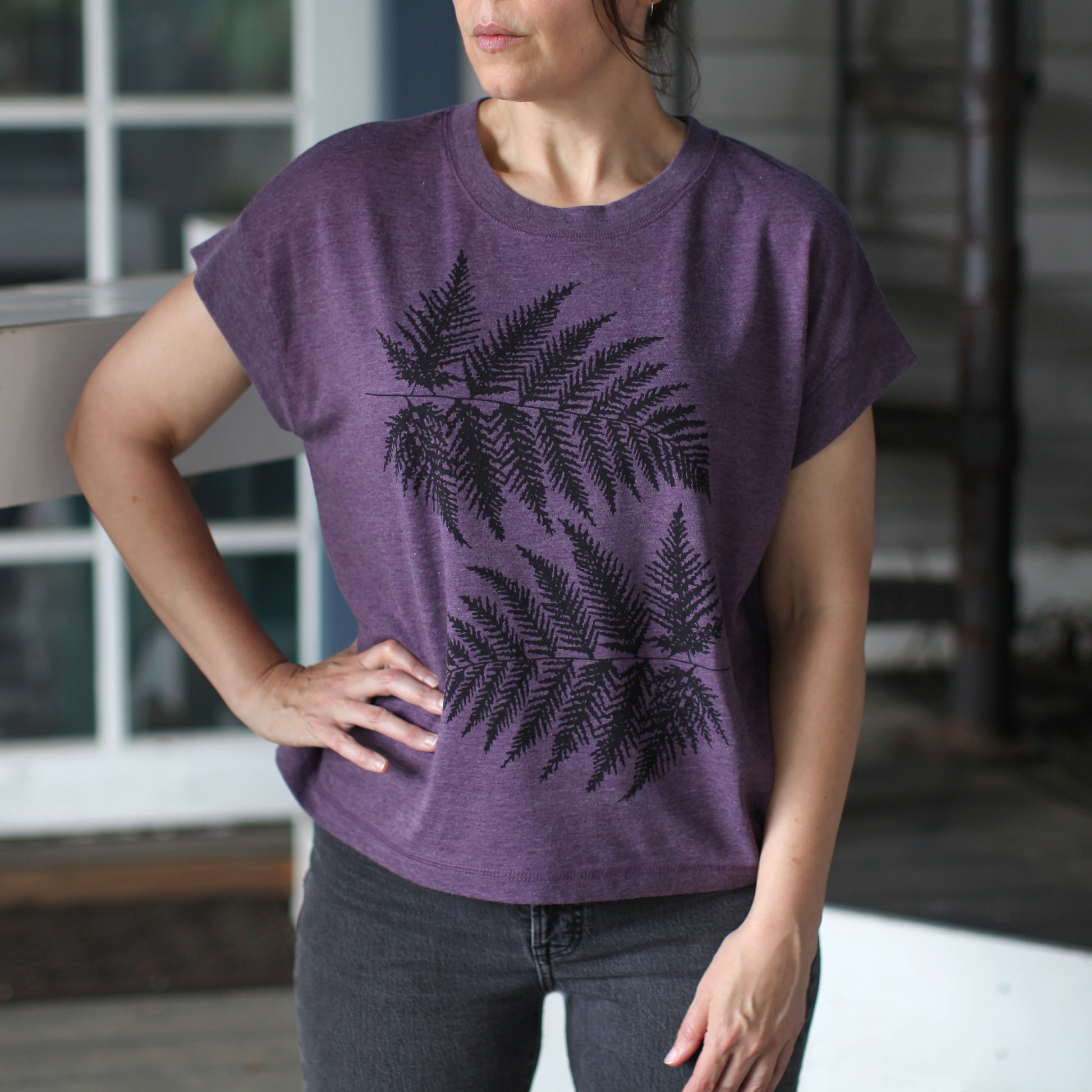 Inspired by our time in the northwest, this botanical print features two oversized fern leaves in dark purple ink against the backdrop of heather plum jersey knit fabric. Feminine and flowy, this top can be dressed up or dressed down, and the cut flatters a variety of body types.