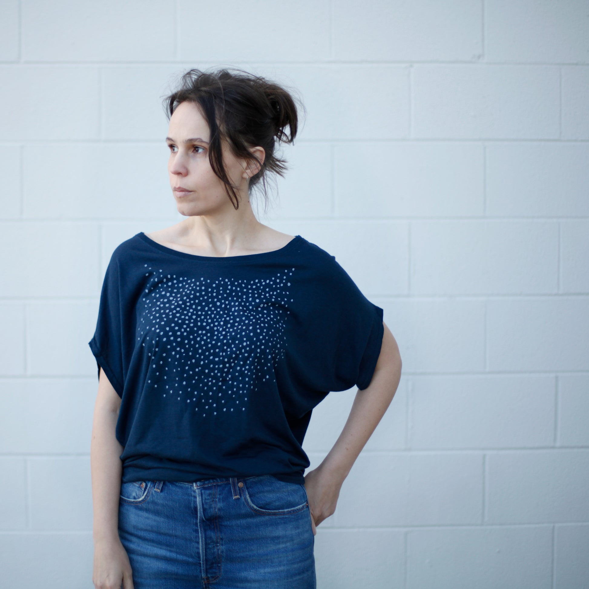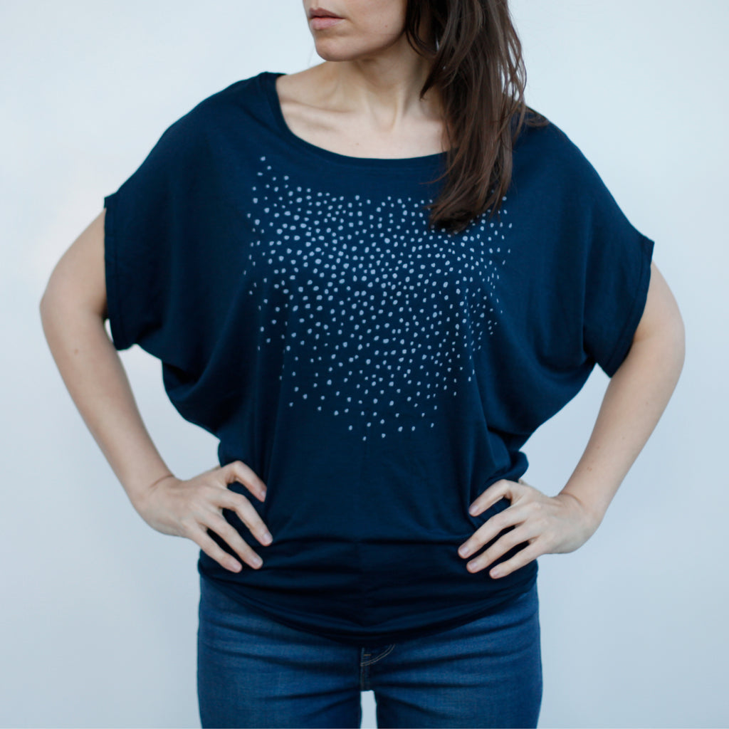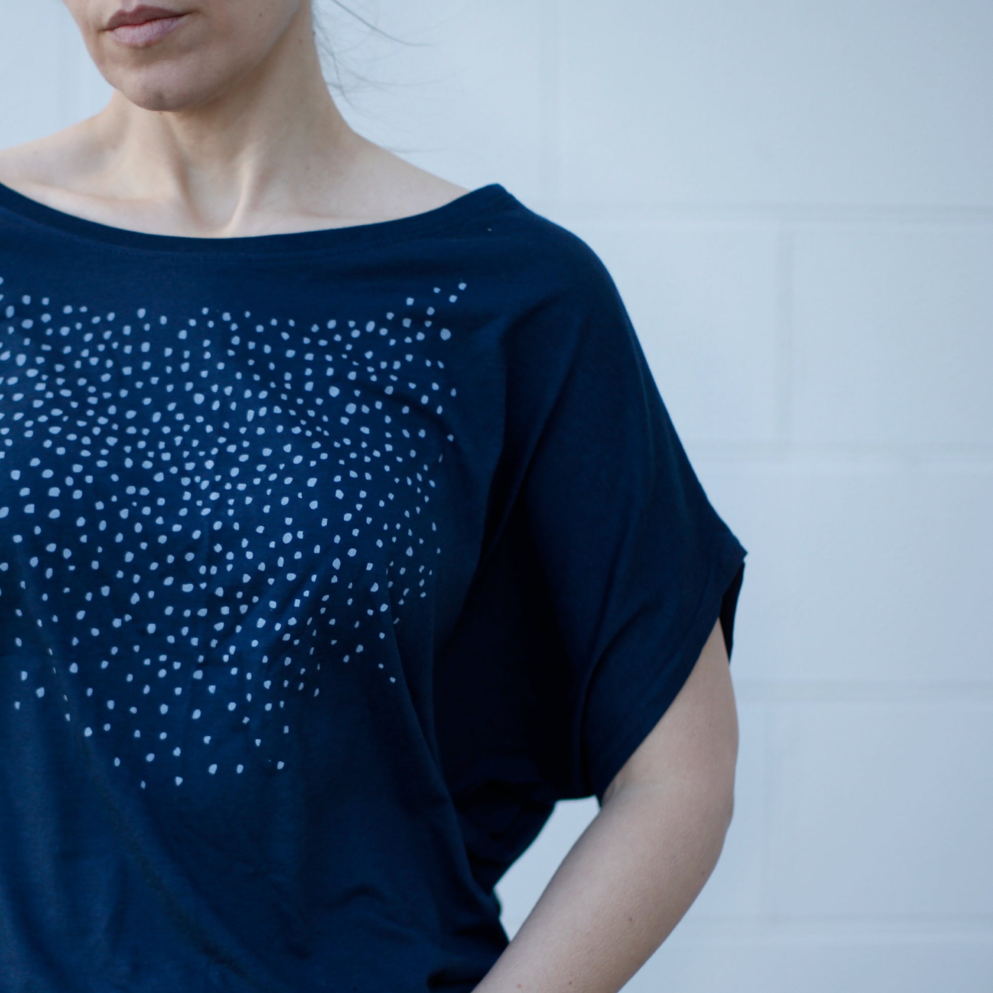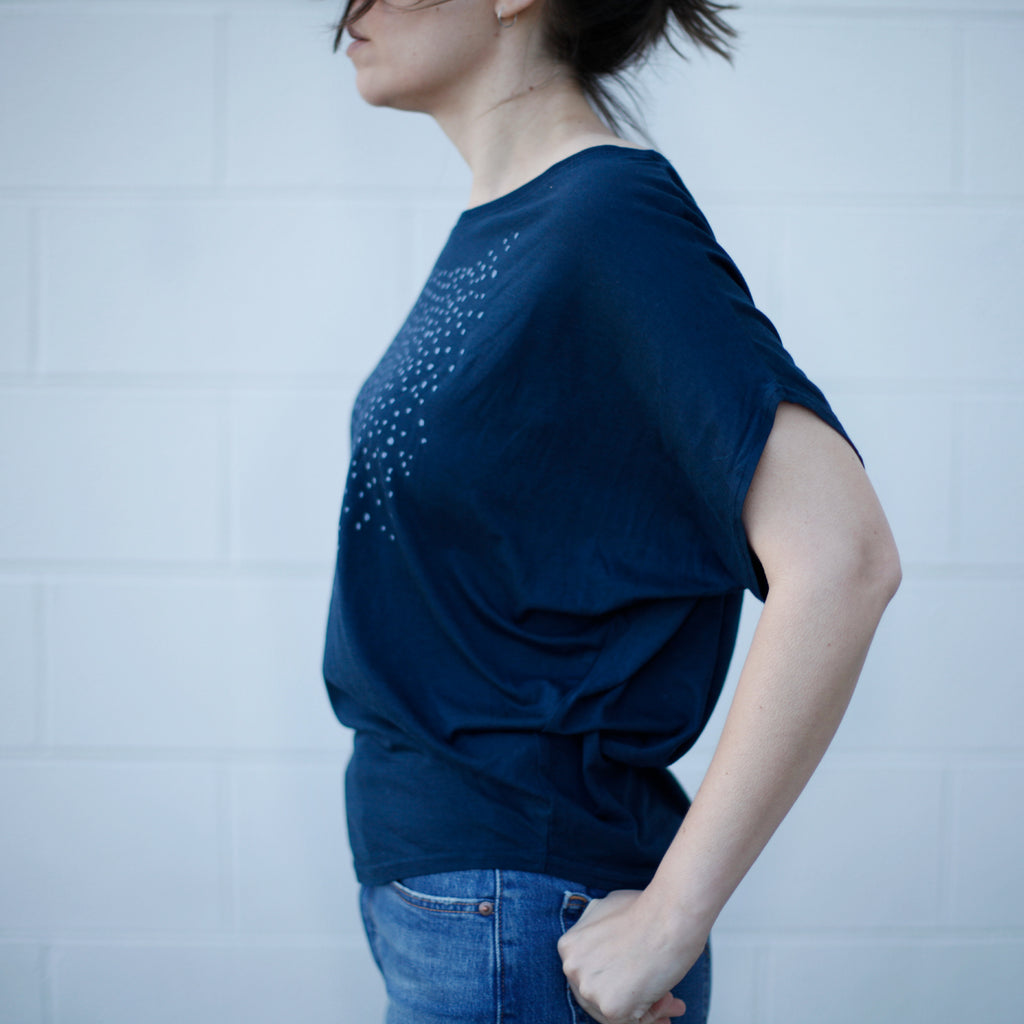 This loose-fitting, boho style top features our Meteor Shower print. Eco-friendly (70% bamboo viscose and 30% organic cotton) and made in the USA. Features a wide neckline that can be worn off the shoulder, and a dramatic drape that tapers down to a fitted hip.