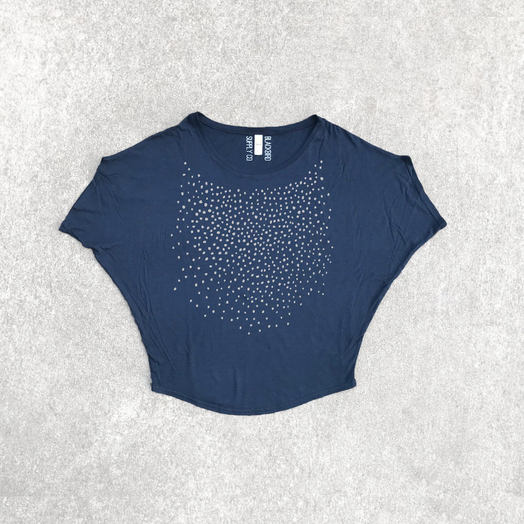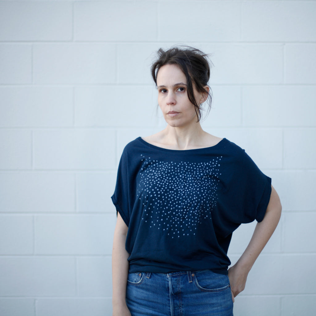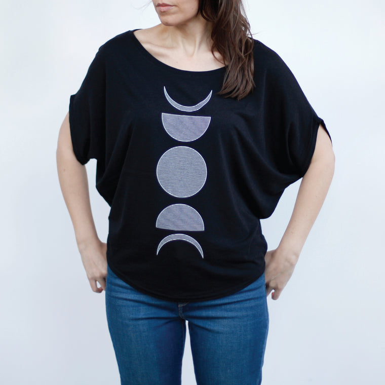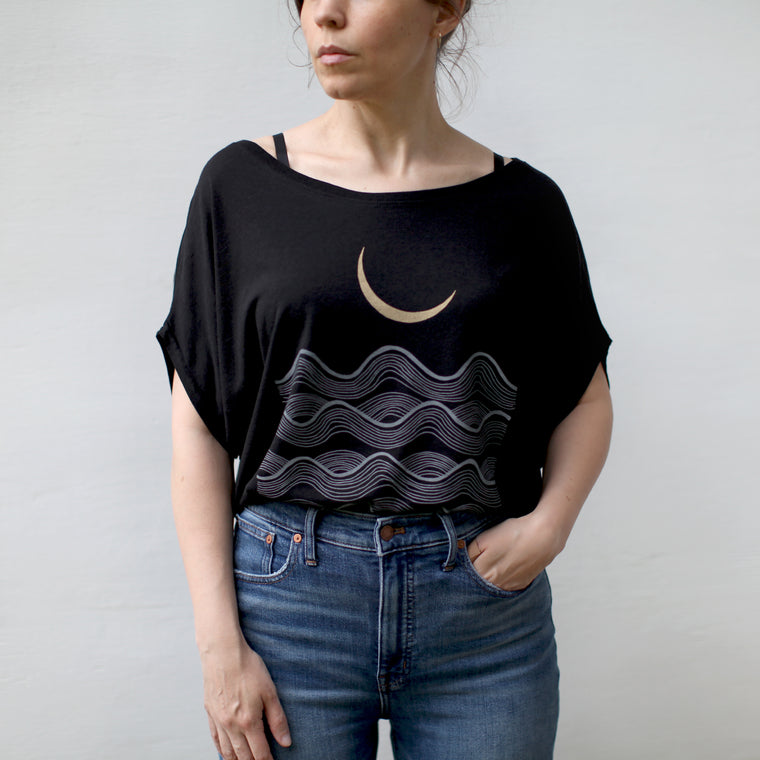 This loose-fitting, boho style top features our Meteor Shower print. Eco-friendly (70% bamboo viscose and 30% organic cotton) and made in the USA. Features a wide neckline that can be worn off the shoulder, and a dramatic drape that tapers down to a fitted hip.
