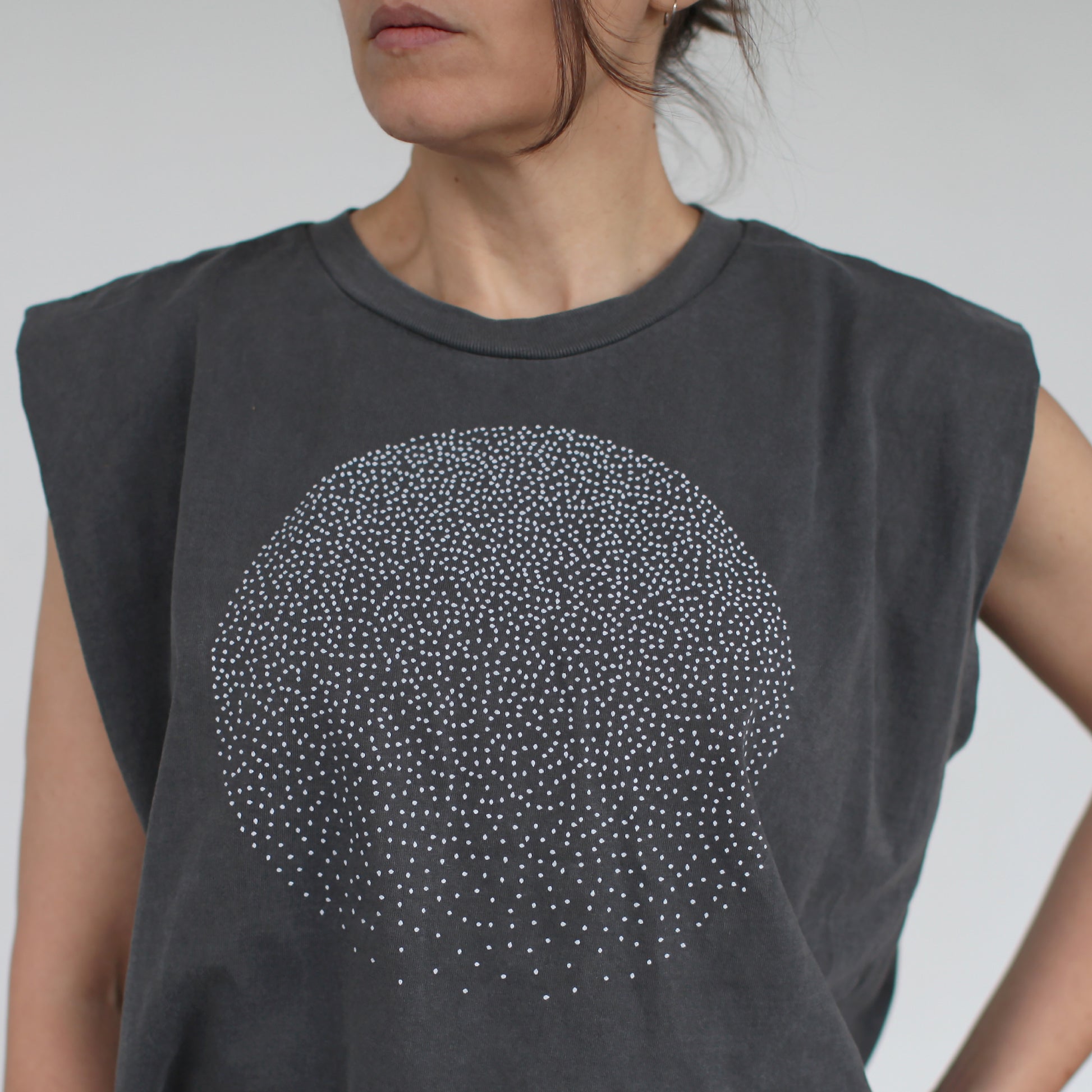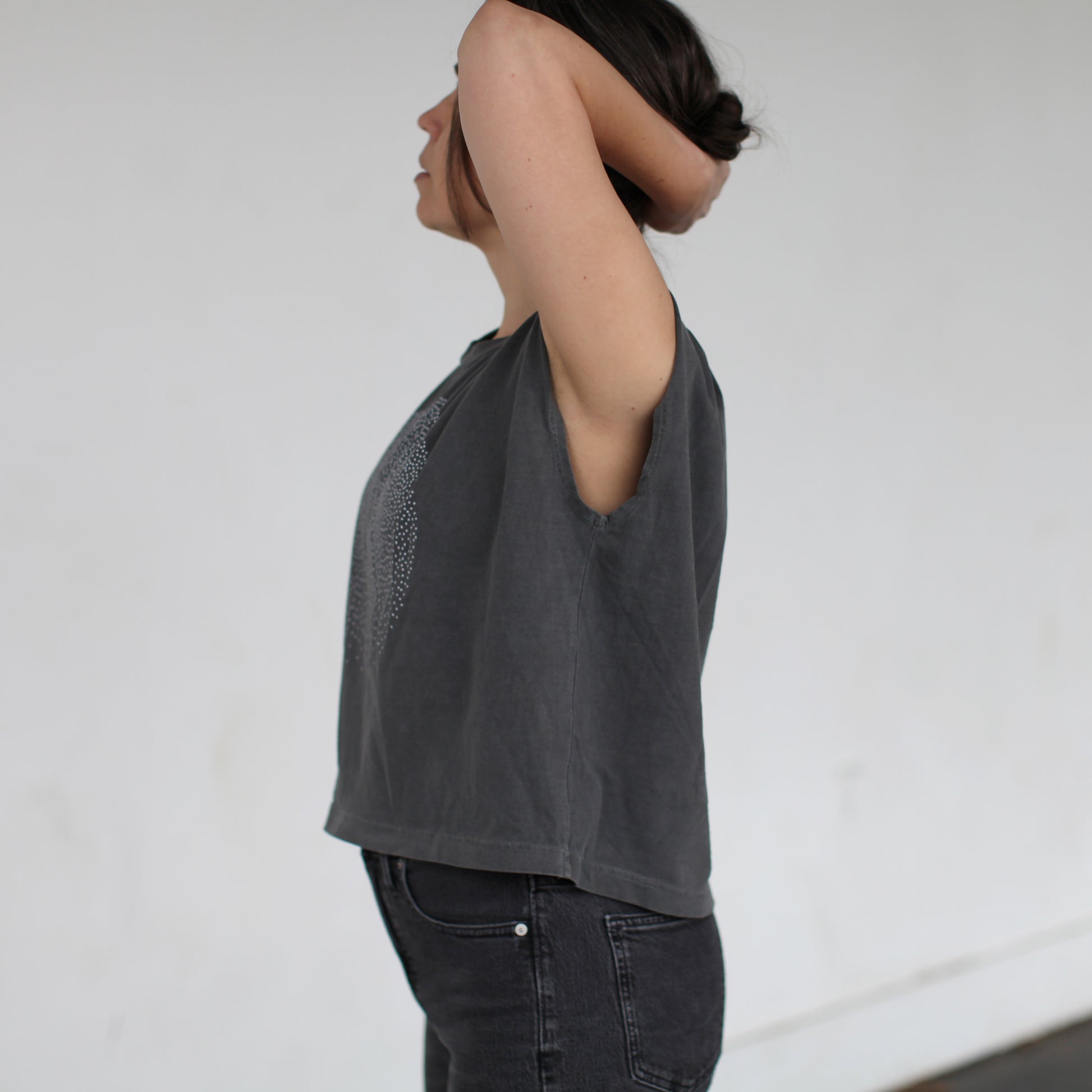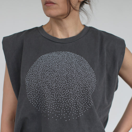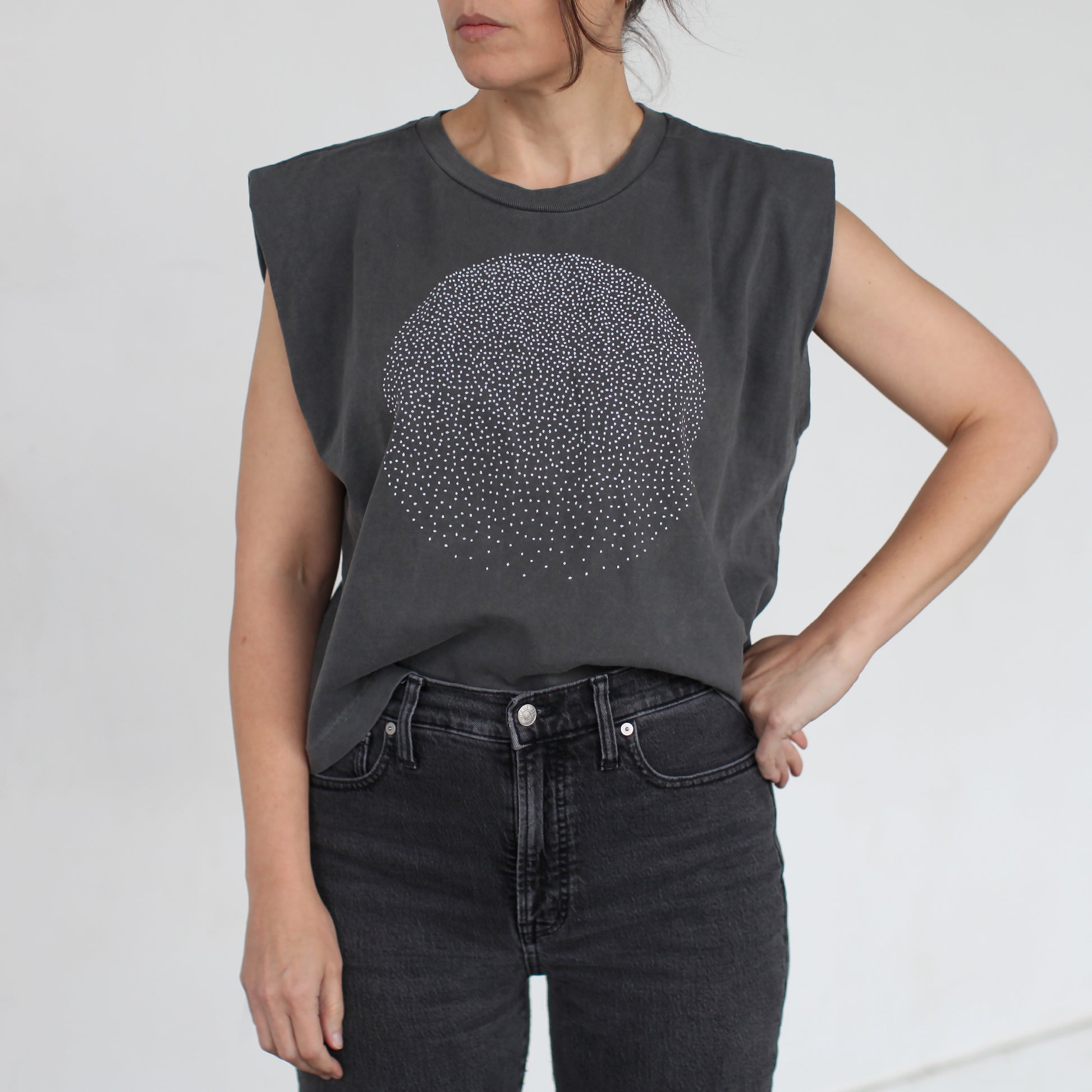 This unique muscle tank style combines an exaggerated power shoulder and heavyweight cotton with a feminine silhouette and just the right amount of drape. Perfect for pairing with your favorite high-waisted jeans. Shirt color is faded black (similar to a deep charcoal gray). Hand printed with white water-based ink. Available in women's sizes S-2XL.
